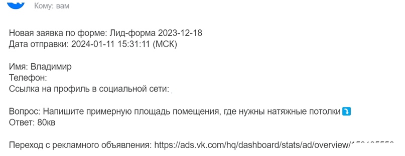 Оформила лид-форму в рекламном кабинете «ВК реклама»
